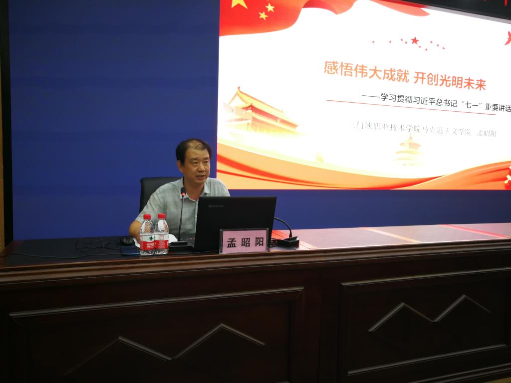 孟昭阳以《感悟伟大成就 开创光明未来——学习贯彻习近平总书记“七一”重要讲话精神》为题,在报告中深刻阐述了习近平总书记“七一”重要讲话的重大意义、主要内容和丰富内涵,深入解读中国共产党百年奋斗的光辉历程、伟大成就、宝贵经验和实践启示,解读伟大建党精神的深刻内涵和时代价值,解读在新征程上以史为鉴、开创未来的根本要求,同时围绕讲话中提出的一系列新思想新观点新要求进行了系统讲解。