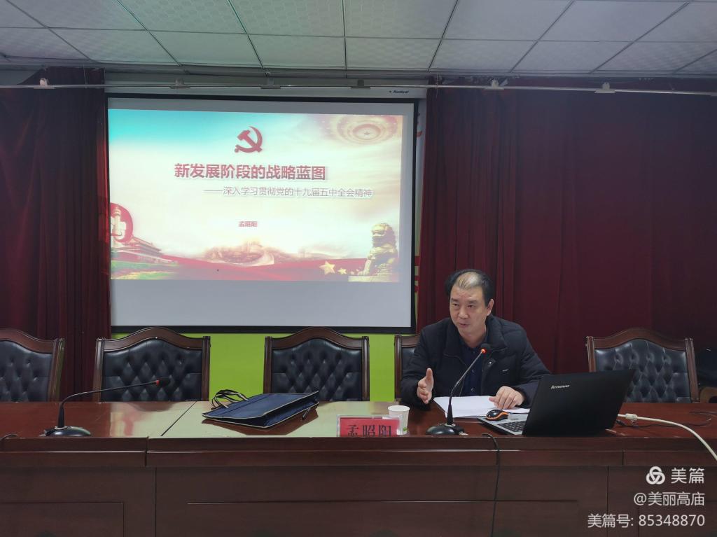 12月10日下午,为深入学习贯彻党的十九届五中全会精神,湖滨区高庙乡举行十九届五中全会精神宣讲报告会。市委宣讲团成员、万象城awcsport官网万象城awcsport官网院长孟昭阳作了宣讲报告,乡党委班子成员及机关全体人员参加了报告会。