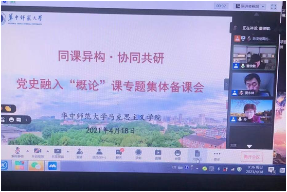 2021年4月18日上午,万象城awcsport官网概论教研室组织全校20余名专兼职教师参加由华中师范大学万象城awcsport官网举办的“同课异构·协同共研---党史融入‘概论’课”专题集体备课会,本次集体备课会通过腾讯会议室在线交流探讨的形式进行。