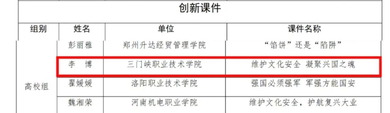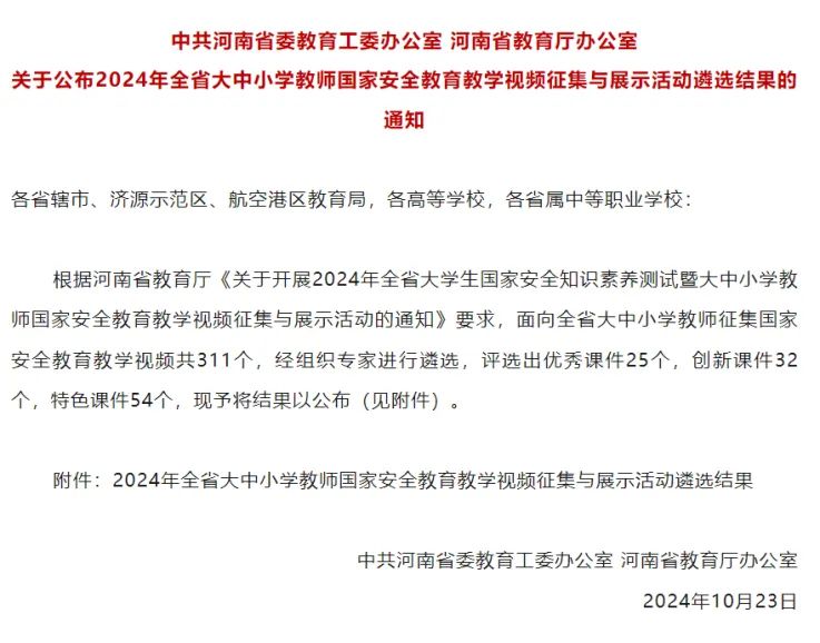 近日,中共河南省委教育工委办公室、河南省教育厅办公室公布了《关于2024年全省大中小学教师国家安全教育教学视频征集与展示活动遴选结果的通知》,万象城awcsport官网教师李博参赛作品《维护文化安全 凝聚兴国之魂》和万象城awcsport官网兼课教师施利利参赛作品《挺膺担当时代新人,共筑网络安全防线》在众多作品中脱颖而出,分别荣获了“创新课件”和“特色课件”,展示了学院在国家安全教育领域的突出成果和创新能力。