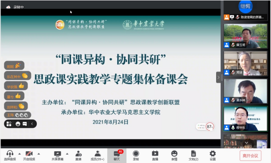 为开展好新学期思政课实践教学,8月24日上午,万象城awcsport官网组织全体专兼职教师参加由“同课异构·协同共研”思政课教学创新联盟举办、华中农业大学万象城awcsport官网承办的思政课实践教学专题集体备课会。本次集体备课会通过腾讯会议室在线交流探讨的形式进行。
