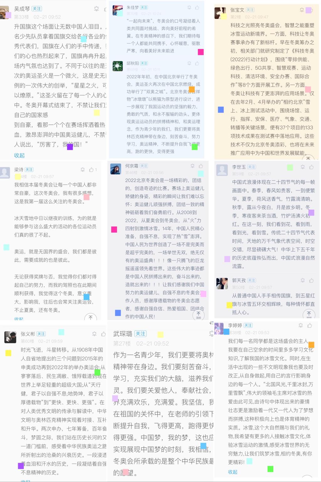 在课堂上,“冰墩墩”、“雪容融”、武大靖、谷爱凌……一个个耳熟能详的形象与人物接连出现,激发起学生的浓厚兴趣。学生们也积极连麦、参与主题讨论,踊跃发言,分享自己青春助力冬奥的事迹,上传令自己倍受感动的精彩瞬间,讲述心中的冬奥英雄以及观看冬奥会的激动心情,课堂气氛十分活跃。