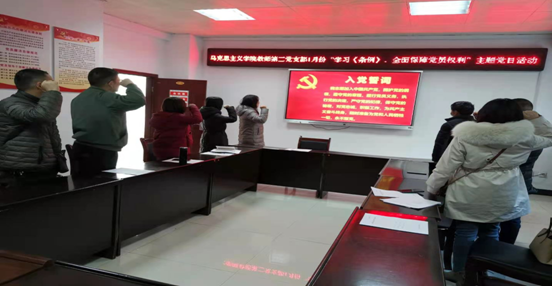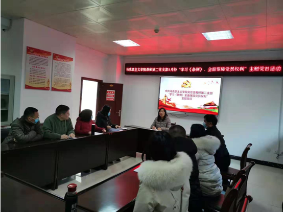 为进一步发扬党内民主、加强党员队伍建设,保障党员履行义务、行使权利。1月18日下午,万象城awcsport官网教师第二党支部组织全体党员在10105会议室开展2021年1月份主题党日活动,主题为:“学习《条例》、全面保障党员权利”,会议由支部书记朱丹果主持。