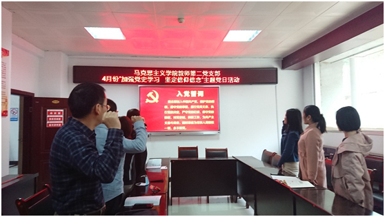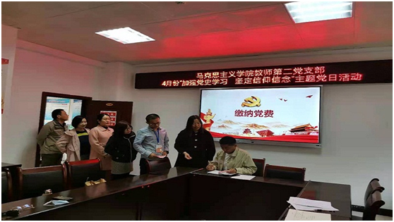 作为思想政治理论课教师,我们更要认真学习体悟,领会核心要义,切实把思想和行动统一到习近平总书记重要讲话精神上来,做到学史明理、学史增信、学史崇德、学史力行,学党史、悟思想、办实事、开新局。随后,支部书记朱丹果对于党史学习发表了自己的观点,她将党史的学习和领悟与教学科研紧密结合,提出学习党史,牢记初心是我们搞教学和科研的根基所在,是我们增强本领的有力武器。最后,支部全体党员依次在党旗面前交纳了本月党费。